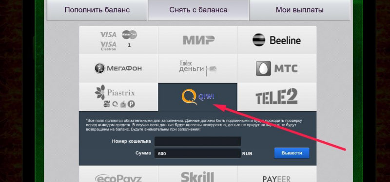 👑 В казино пополнить депозит или вывести деньги со счета можно используя платежные системы МастерКард, Яндекс Деньги, Киви, Мобильные операторы и иные.