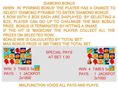 Третьим специальным символом выступает бонусный знак в виде пирамиды. 3 изображения пирамид открывают игроку бонусный раунд. Призовой раунд открывает перед игроком пять рядов с закрытыми картинками. Один из пяти столбцов будет призовым.