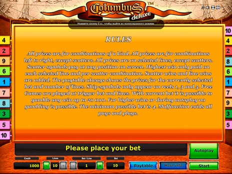 Игровой автомат Columbus Deluxe формирует оплачиваемые комбинации на 10 игровых полосах. Такое количество активных линий гораздо выше, нежели в таких игровых автоматах, как King of cards, Columbus, Bananas go Bahamas , Crazy Monkey и др.