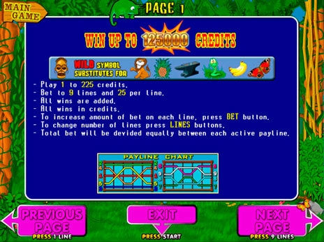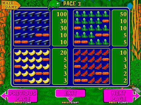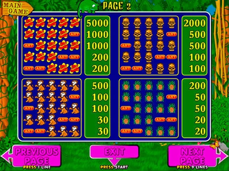 Максимальный выигрыш игрового автомата Обезьянки достигает 5 000 долларов США. Фиксированная выплата видео слота на порядок выше, чем у таких аппаратов, как La Fiesta, Wild West, Party Line и др.