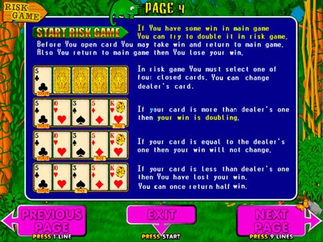 Процесс рискованного тура протекает следующим образом. На экране открывается новое окно с риск игрой. Перед клиентом появляется 5 игральных карт. Одна карта принадлежит дилеру. Его карта открыта. Ее номинал виден клиенту казино. Оставшиеся 4 карты развернуты рубашкой. Рискованный тур рассчитан на интуицию и удачливость клиента. Пользователь выбирает одну из закрытых карт и надеется на то, что выбранная им карта будет старше, чем карта дилера.